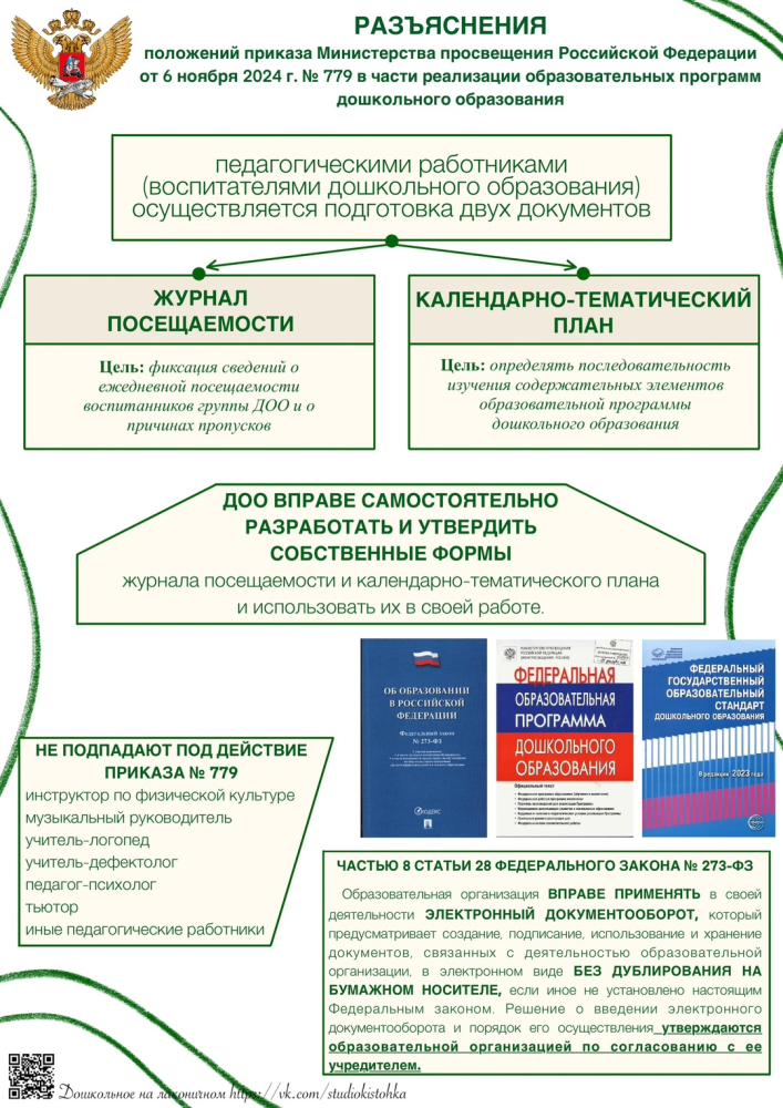 РАЗЪЯСНЕНИЯ положений приказа Министерства просвещения Российской Федерации от 6 ноября 2024 г. № 779 в части реализации образовательных программ дошкольного образования